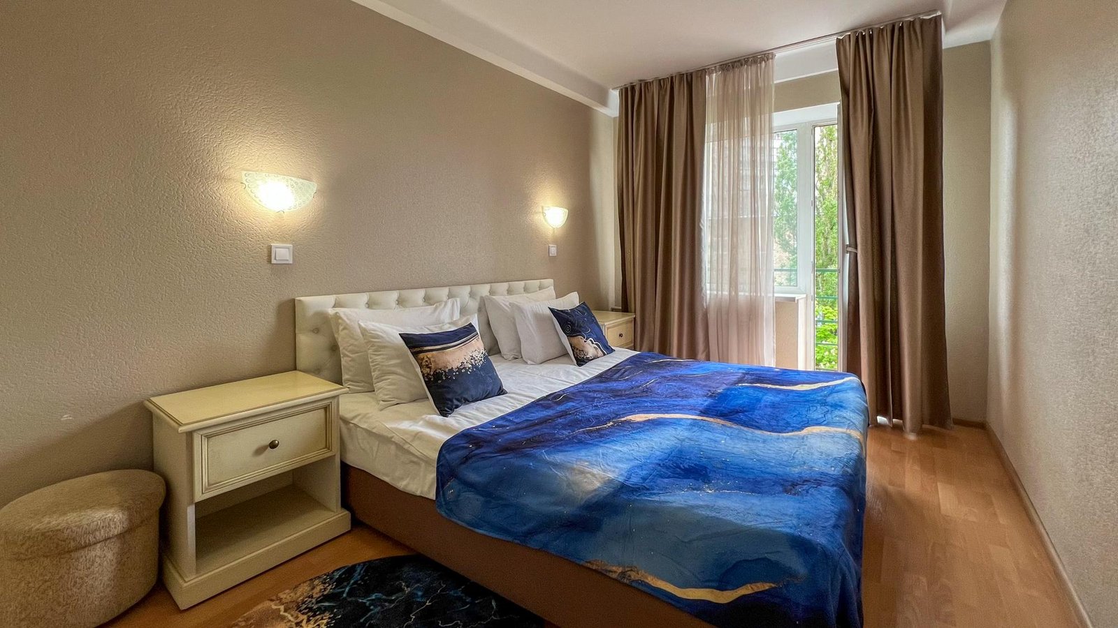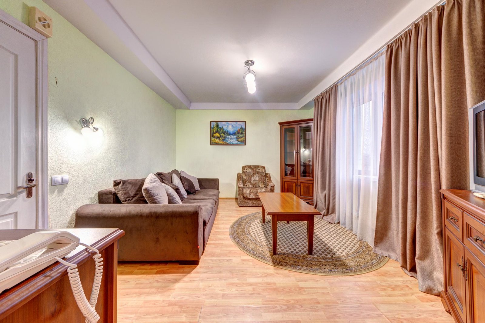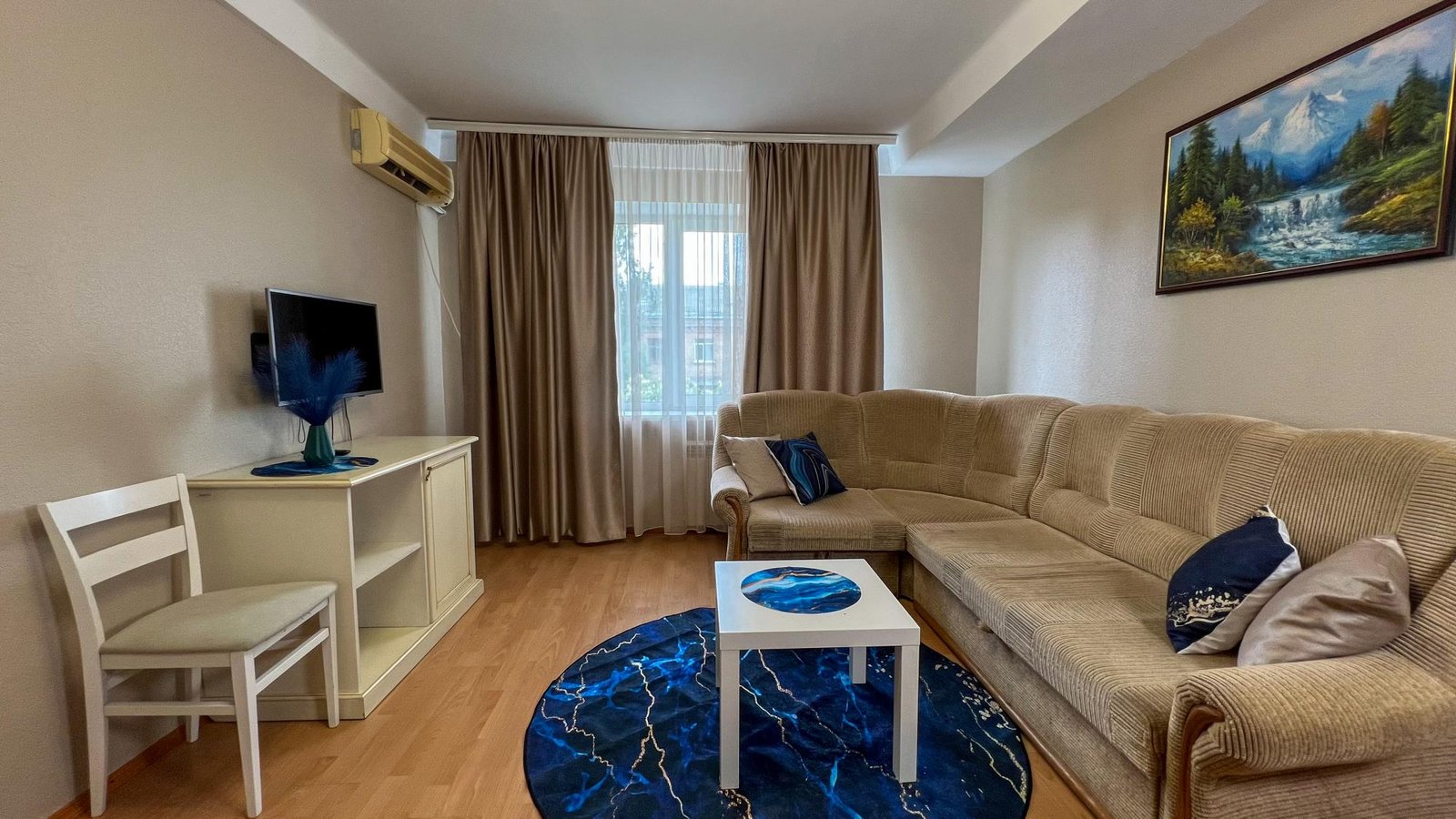 Просторий та комфортний номер, ідеальний для проживання 2–4 гостей. У номері — велике двоспальне ліжко та розкладний двоспальний диван, кондиціонер, телевізор, холодильник, шафа для одягу, комод, письмовий і обідній столи, крісло та повне оснащення для зручного відпочинку.