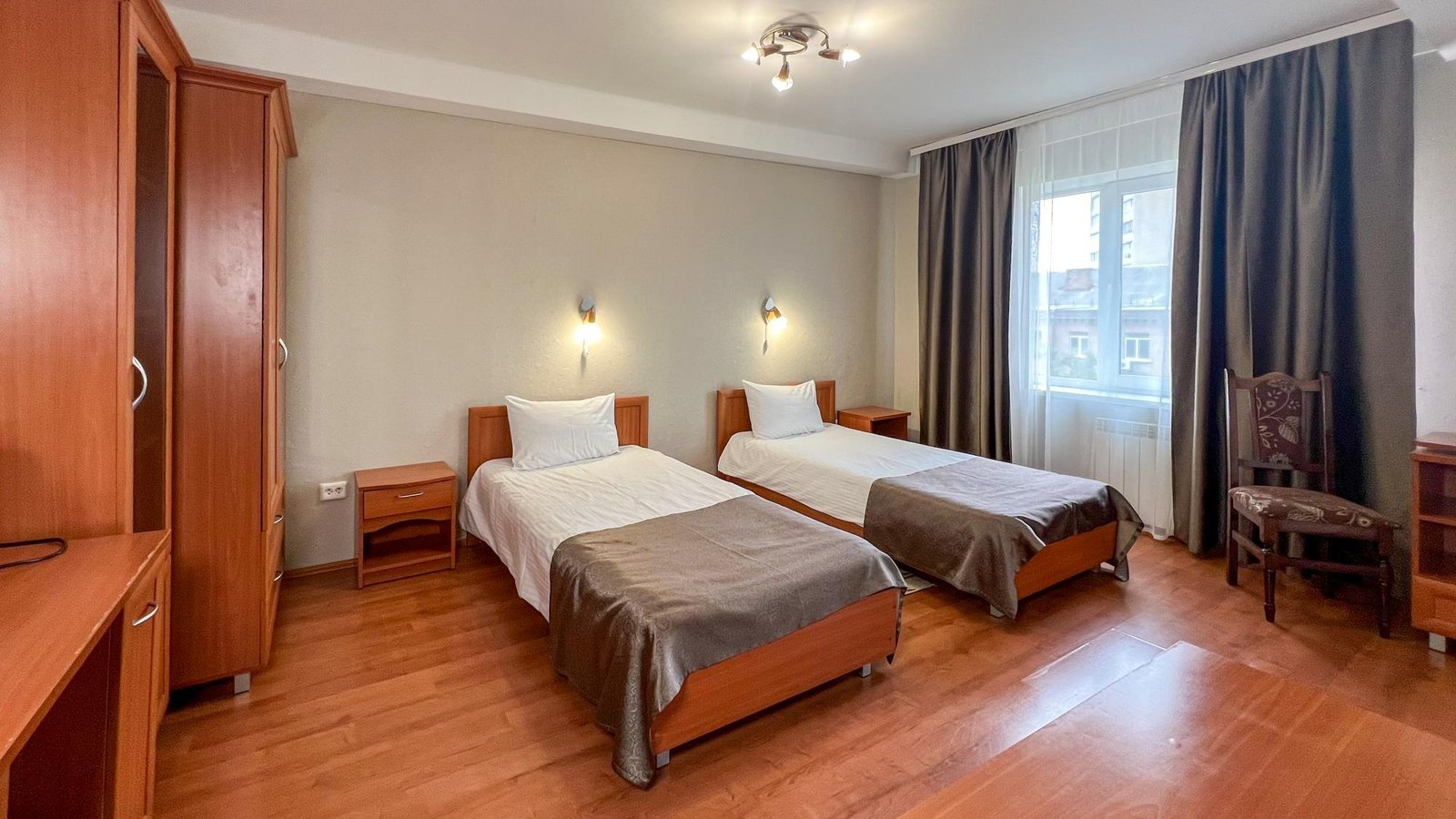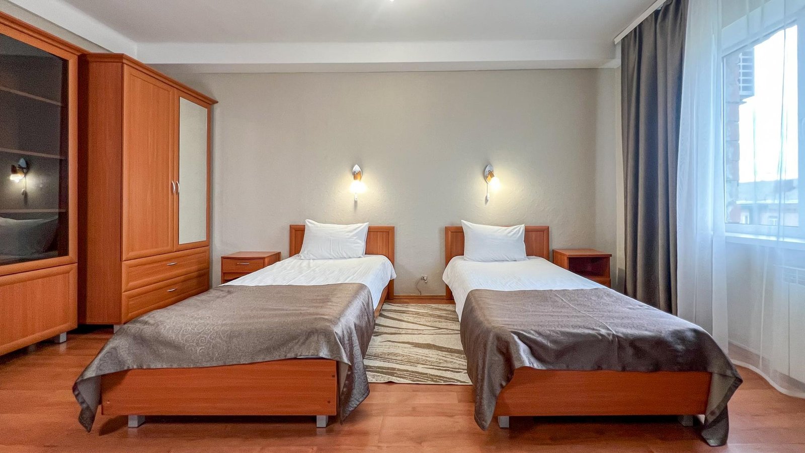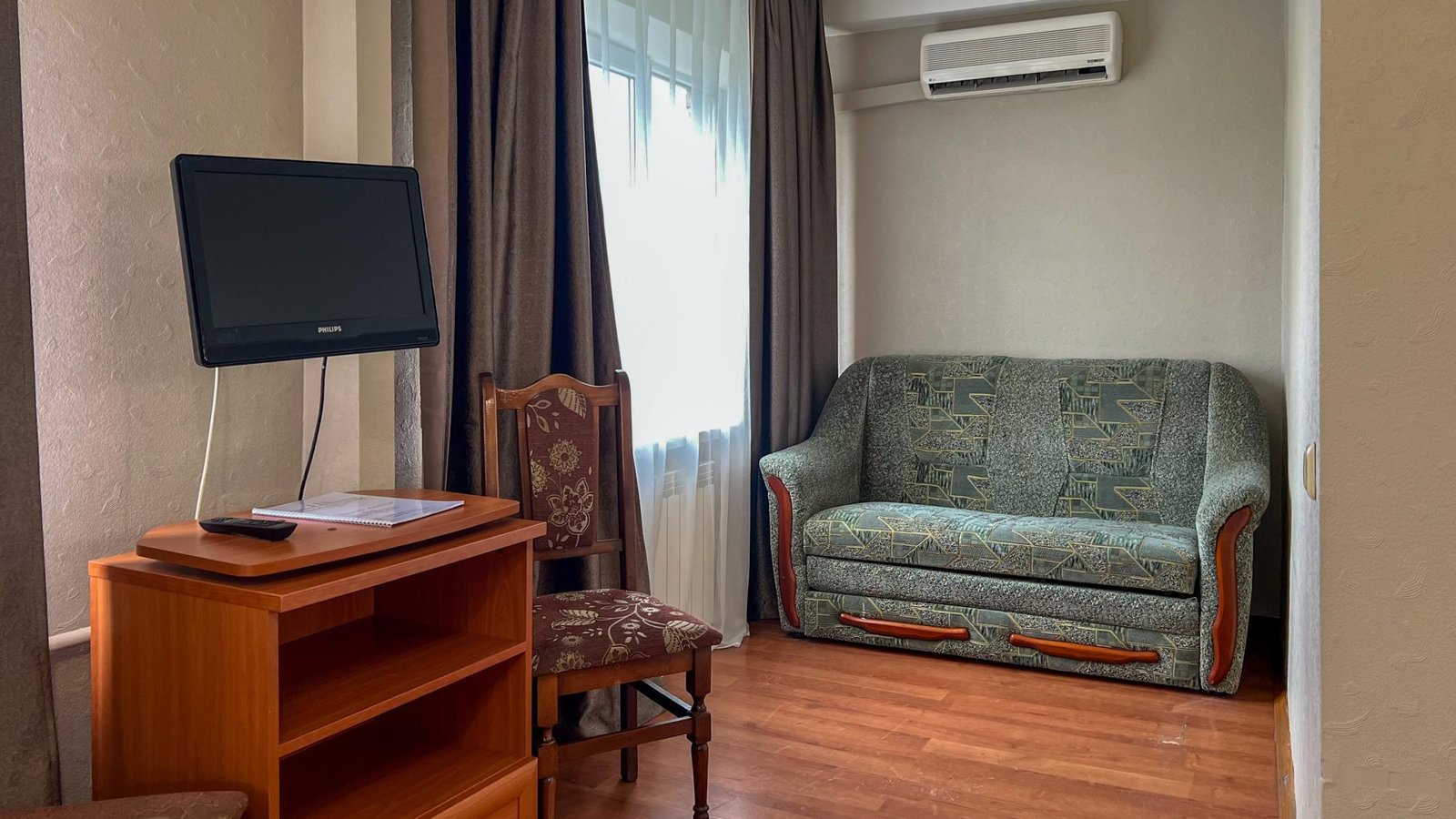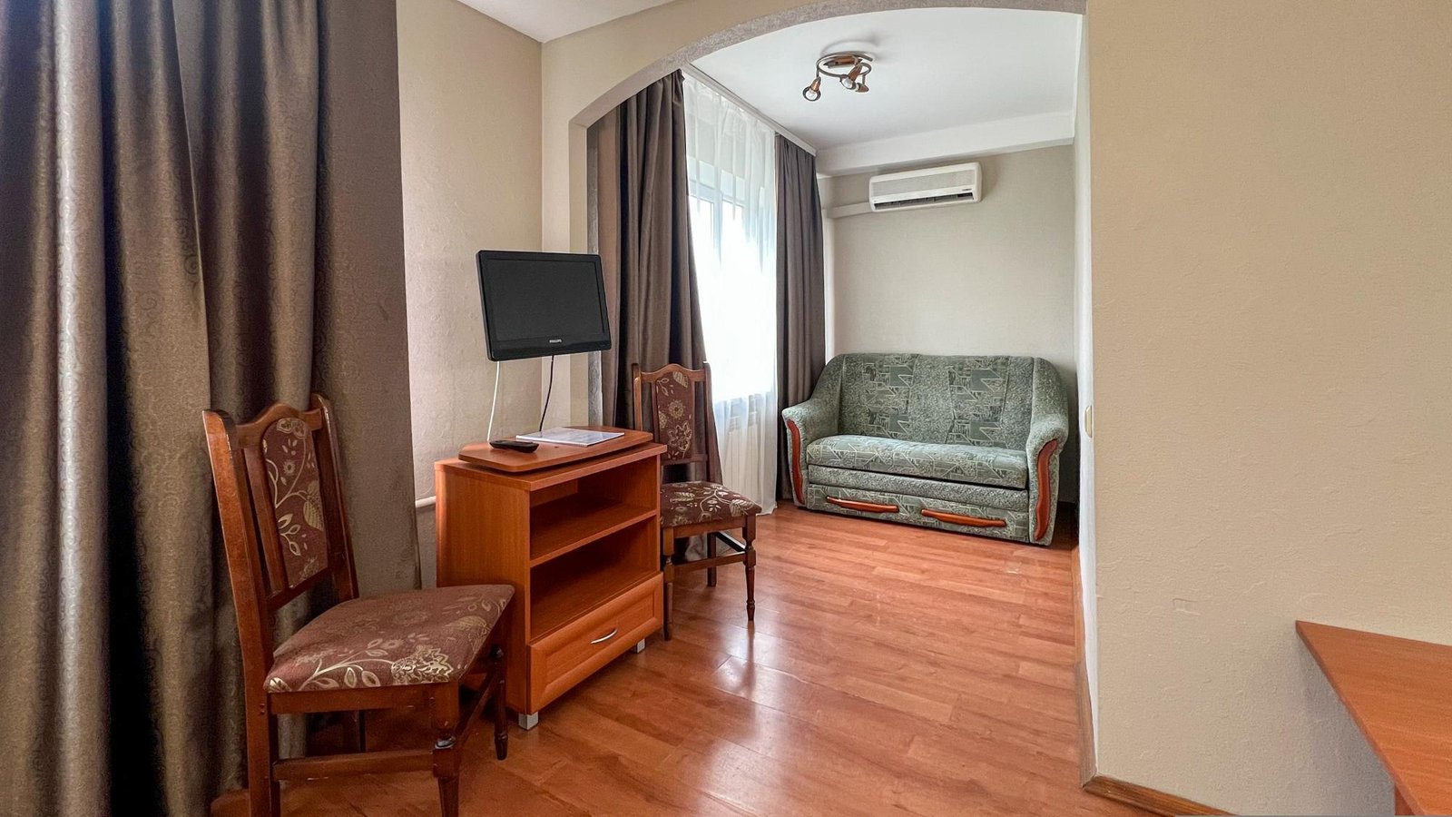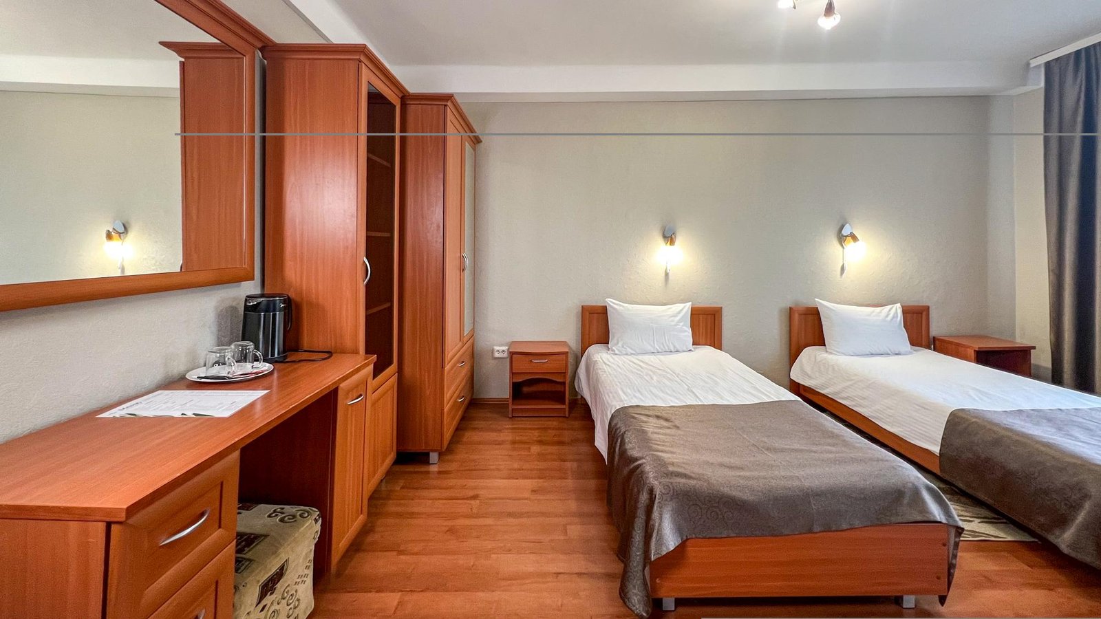 Просторий номер із двома окремими ліжками та диваном, підходить для комфортного проживання двох гостей. У кімнаті передбачені шафа для одягу та посуду, передпокій із дзеркалом, тумба для взуття, приліжкові тумби, косметичний і робочий столи, журнальний столик, крісло, розкладний диван, телевізор, холодильник і вентилятор. Для зручності гостей — чайник і посуд для чаю на двох.
