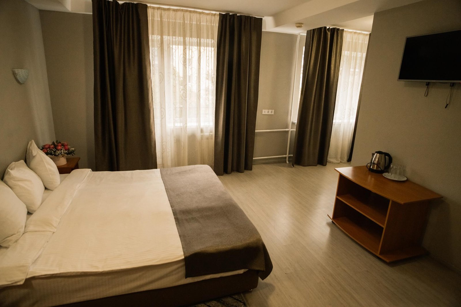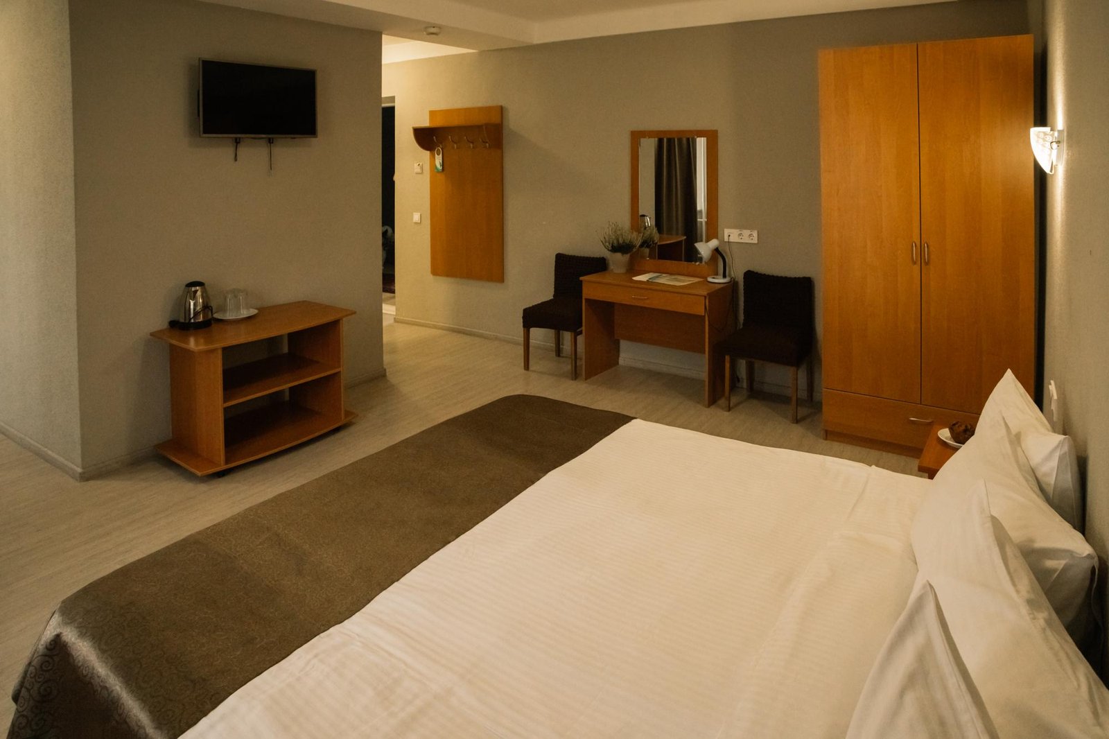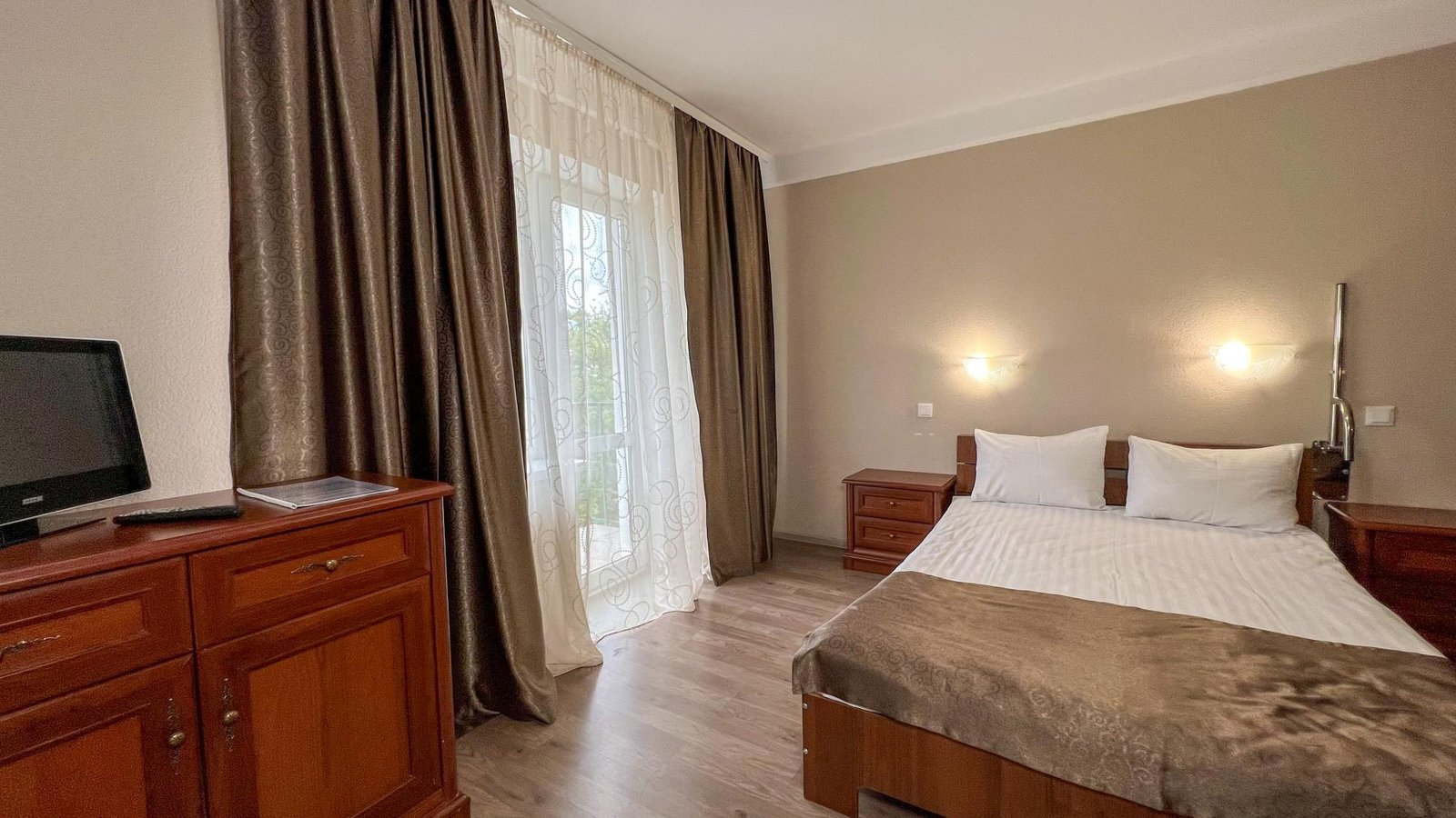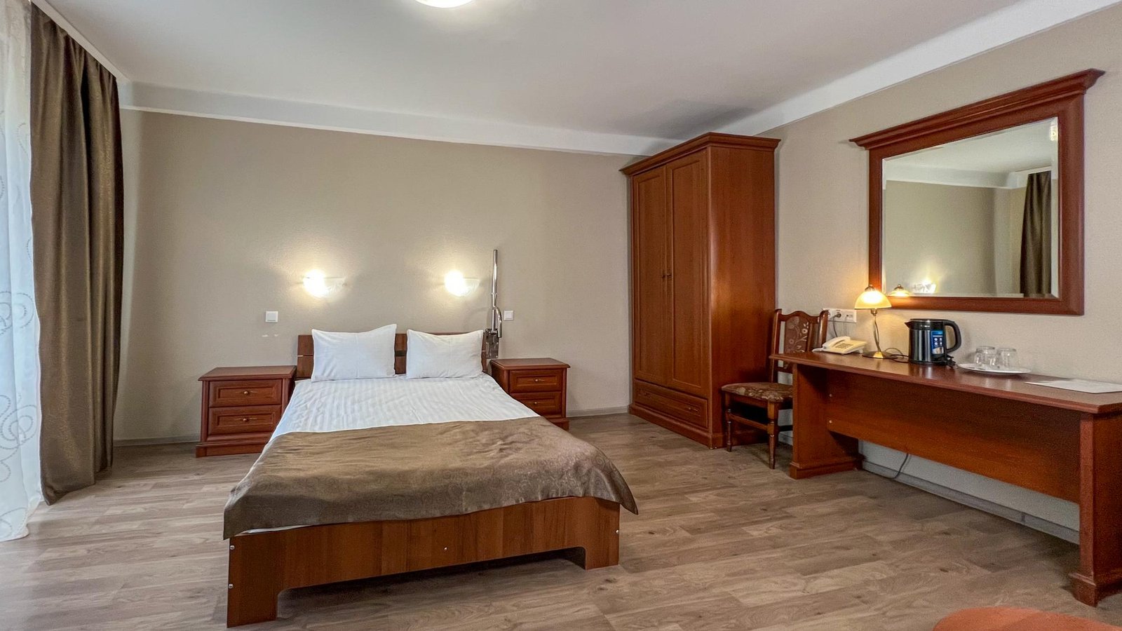 Номер із великим двоспальним ліжком та розкладним диваном. У кімнаті — шафа для одягу, комод, тумба для взуття, приліжкові тумби, робочий та журнальний столи, крісло, кондиціонер, телевізор і холодильник. Для зручності гостей передбачені чайник і посуд для чаю на двох.