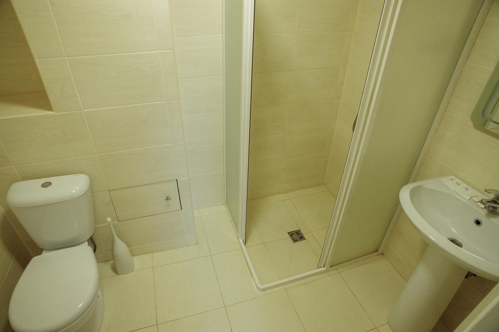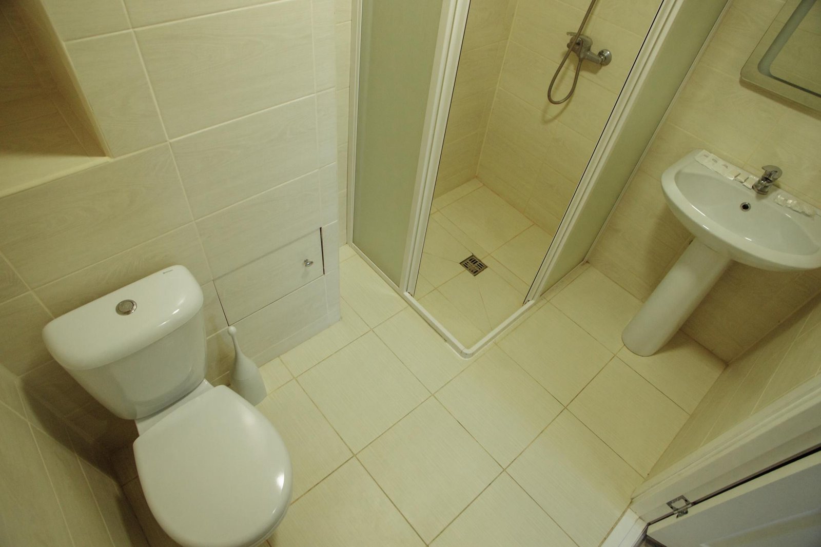 Санвузол обладнаний душовою кабіною, рушниками, косметикою та сушаркою для рушників.