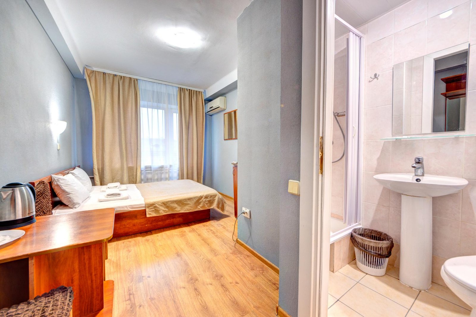 Стандартний номер із двоспальним ліжком для комфортного проживання. У номері — шафа для одягу, тумба, робочий стіл і телевізор. Санвузол обладнаний душовою кабіною, сушаркою, рушниками та косметикою.